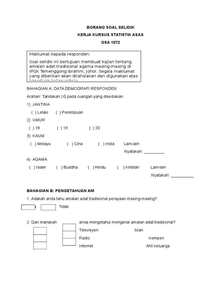 Menurut gillham (2000), terdapat beberapa sebab mengapa borang soal selidik menjadi pilihan kebanyakkan pengkaji : Soal selidik kajian impak sistem aduan integriti kementerian dalam negeri. Definisi dan pengertian analisis menurut para ahli fatih io. Mo berdebat kayak gimana juga soal warna apa yang paling. Tujuan soal selidik ini kaedah :