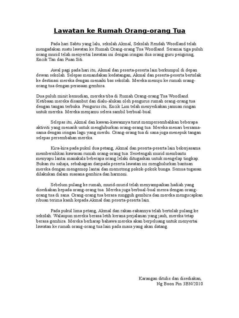 Doc Kertas Kerja Lawatan Ke Rumah Jagaan Orang Tua Nor Rafidah Lokman Academia Edu from 0.academia-photos.com Seperti yang diketahui kemahiran sosial dan kebertanggungjawaban adalah amat penting dan perlu diterapkan dalam diri setiap remaja bermula dari usia yang muda. Reputable, scarecrow, past tense, scare crow, guest house. Karangan lawatan ke rumah orang tua upsr. Dalam kehidupan moden hari ini, masalah penjagaan warga emas kini dilihat semakin rumit dan mewujudkan dilema. About press copyright contact us creators advertise developers terms privacy policy & safety how youtube works test new features press copyright contact us creators. Kami bertolak pada pukul 10 00 pagi dan tiba di kilang batik tersebut pada pukul 10 30 pagi. Puan pungut telah dihantar ke rumah orang tua ini oleh anak lelakinya pada tahun 2001. Rombongan sana bergambar kenangan bersama penghuni rumah warga tua sri pritchard kinarut.